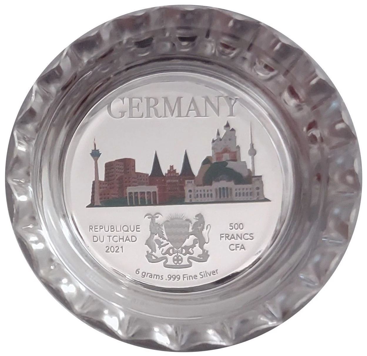 Description: German landmarks in color, with Chad's emblem, denomination, mint year, weight, and purity.