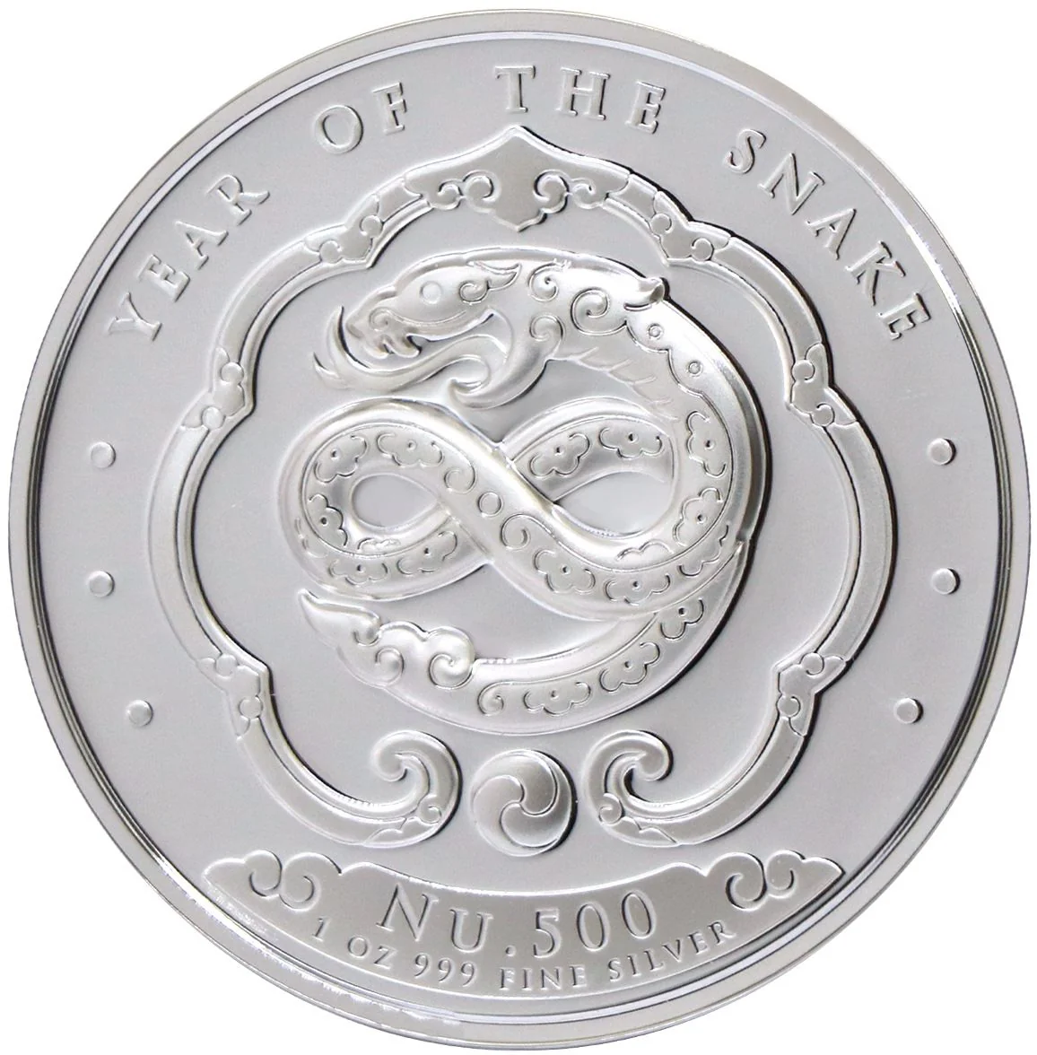 Snake coiled as an infinity symbol, with value, weight, and fineness inscribed below.