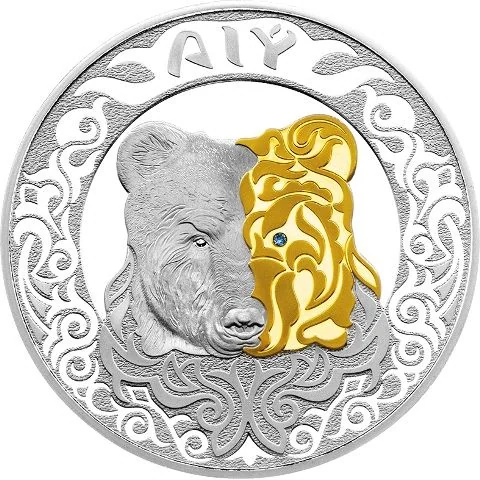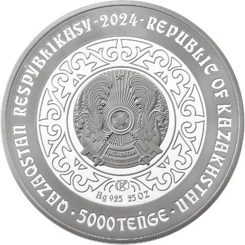 Description: The central field features the national coat of arms, mint mark, and metal specifications within an ornamental frame. Circling the coin are the inscriptions "QAZAQSTAN RESPÝBLIKASY" and "REPUBLIC OF KAZAKHSTAN." The year "2024" appears at the top, and the denomination is at the bottom.