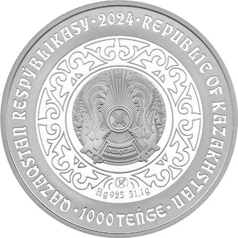 Description: The central field features the national coat of arms, mint mark, and metal specifications within an ornamental frame. Circling the coin are the inscriptions "QAZAQSTAN RESPÝBLIKASY" and "REPUBLIC OF KAZAKHSTAN." The year "2024" appears at the top, and the denomination is at the bottom.