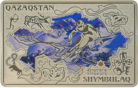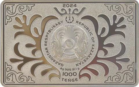 Description: Centered on an ornamental background is Kazakhstan's State Emblem, framed by inscriptions of the country's name in Kazakh and English. Above the emblem is the issuing bank's logo. The minting year is at the top; the metal type, fineness, weight, and denomination are at the bottom.