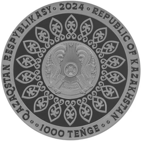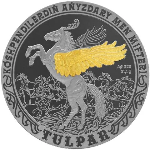 Description: A stylized winged horse (Tulpar) is centered before a herd. The right side states the metal, fineness, and weight. Circular inscriptions read "KÓSHPENDILERDIŃ AŃYZDARY MEN MIFTERI" and "TULPAR," separated by national patterns.