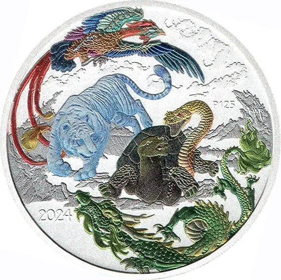 The four celestial guardians: Azure Dragon, Vermilion Bird, White Tiger, and Black Tortoise entwined with a Yellow Snake.