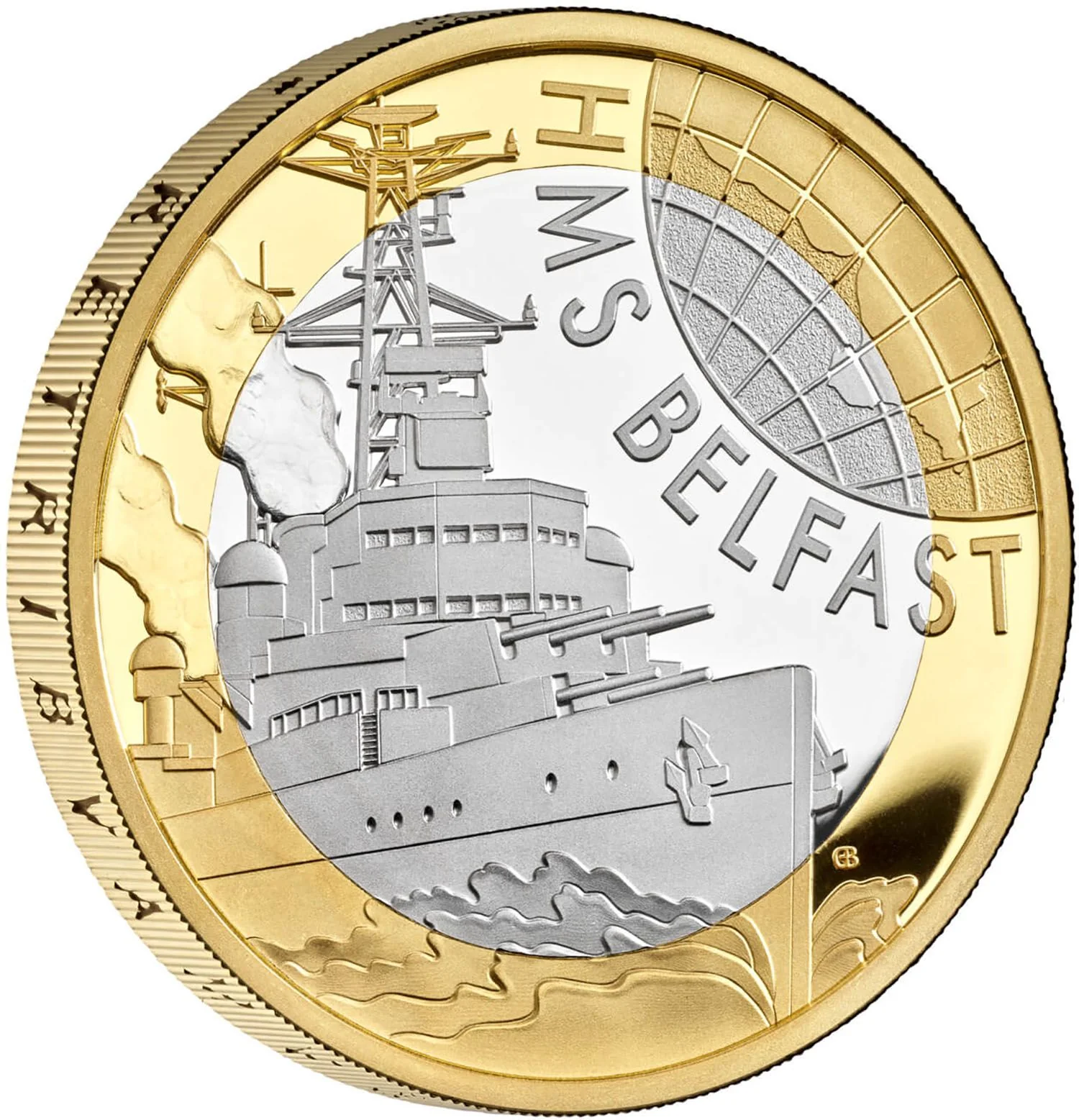 HMS Belfast with globe and caption.