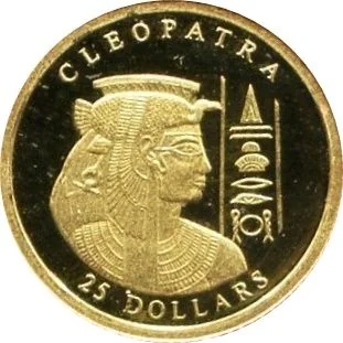 Cleopatra's bust facing right with vertical hieroglyphs.