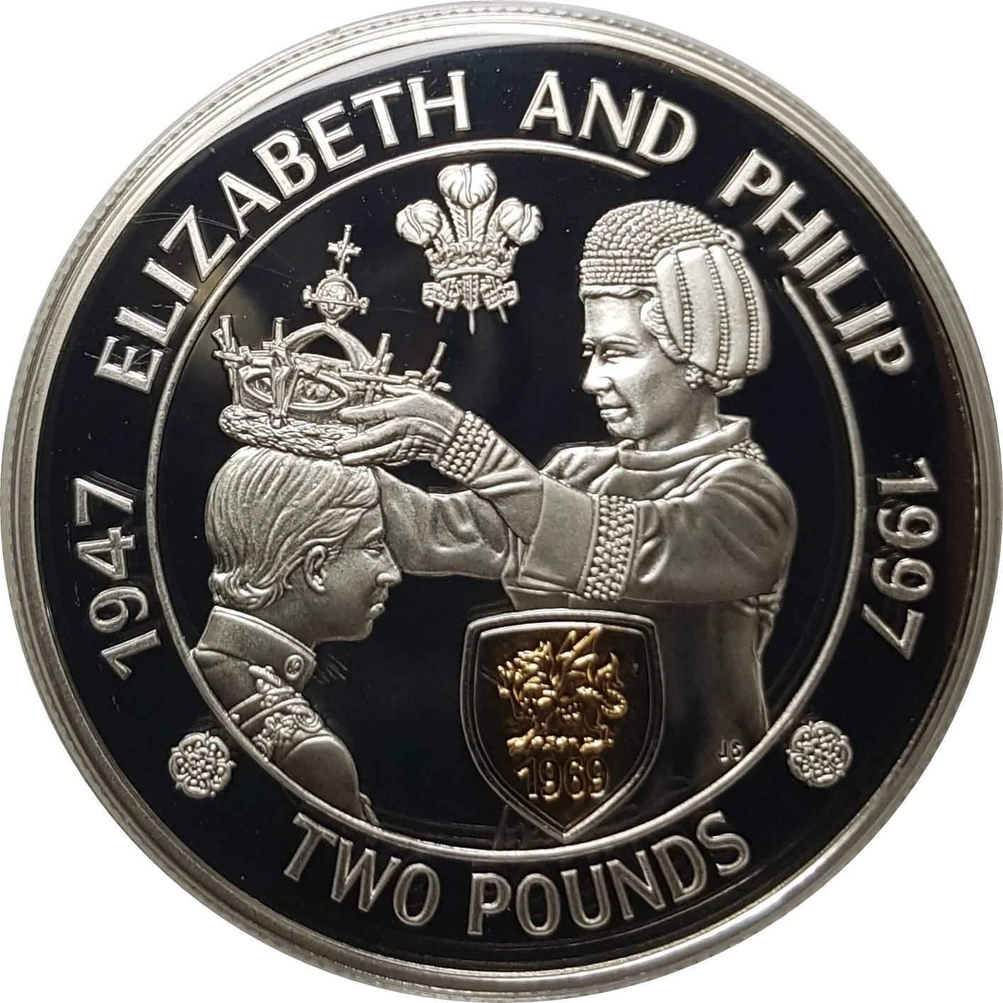 Prince Charles receiving the Prince of Wales crown from Queen Elizabeth II, over a golden shield.
