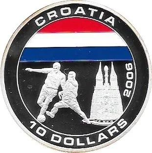 Croatian flag, football players, and Zagreb Cathedral with the Mary monument.