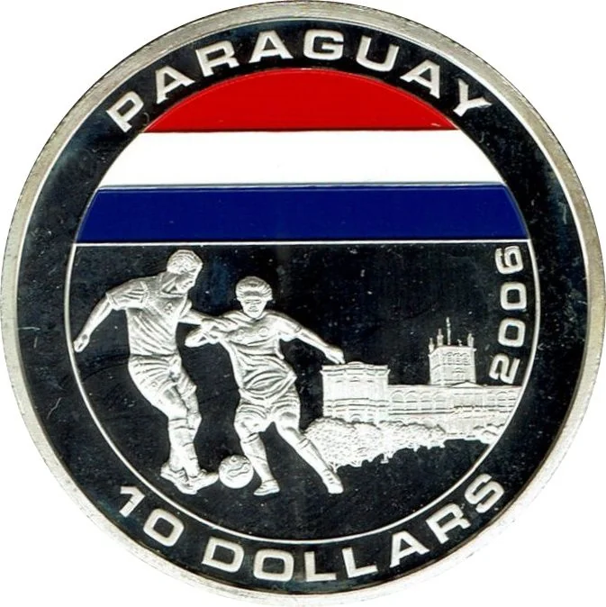 Paraguay's flag, two football players, and the Palacio de los López (Government Palace) in Asunción.