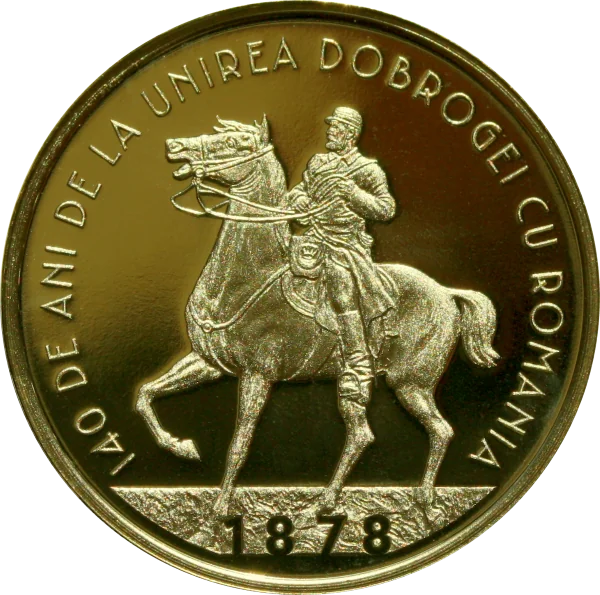 King Carol I on horseback, with the inscription "140 DE ANI DE LA UNIREA DOBROGEI CU ROMANIA" arched above and the year "1878".