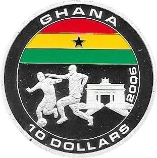 Ghana's flag, two football players, and Accra's Black Star Gate.