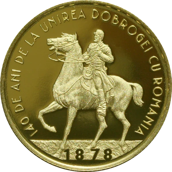 King Carol I on horseback, with the inscription "140 DE ANI DE LA UNIREA DOBROGEI CU ROMANIA" arched above and the year "1878".
