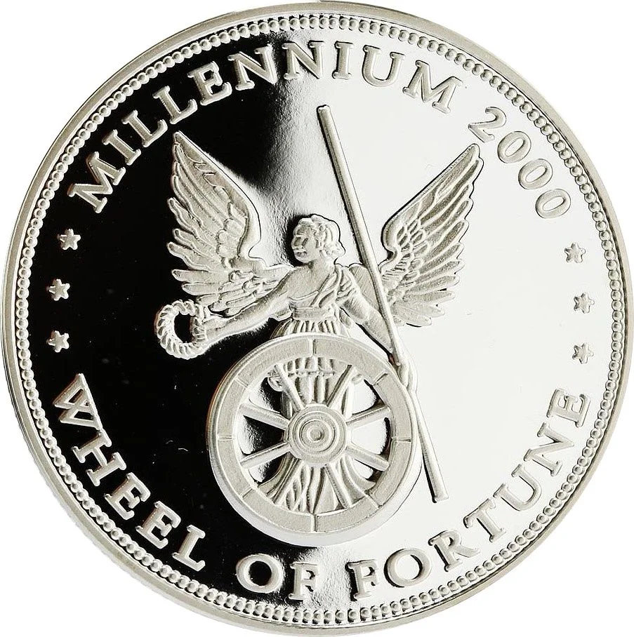 A winged female allegory of fortune, holding a staff, rudder, and wreath beside a wheel.