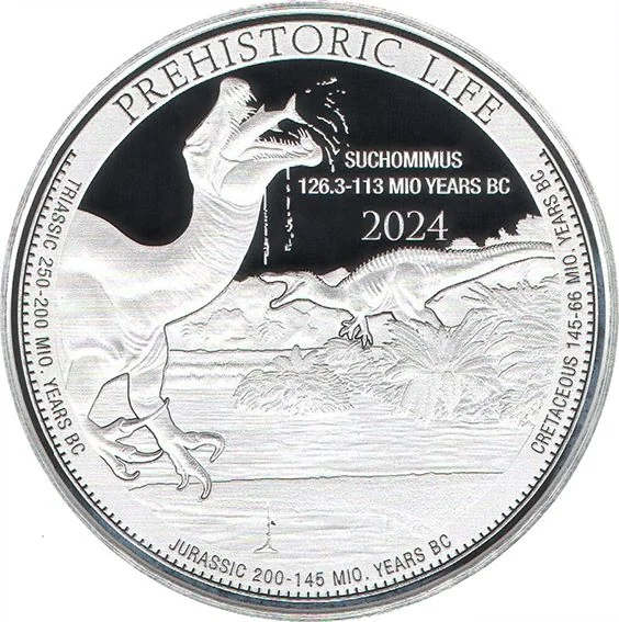 Two Suchomimus in a prehistoric landscape. One gulps down a fish while the other roars, with a river winding through the terrain behind them.