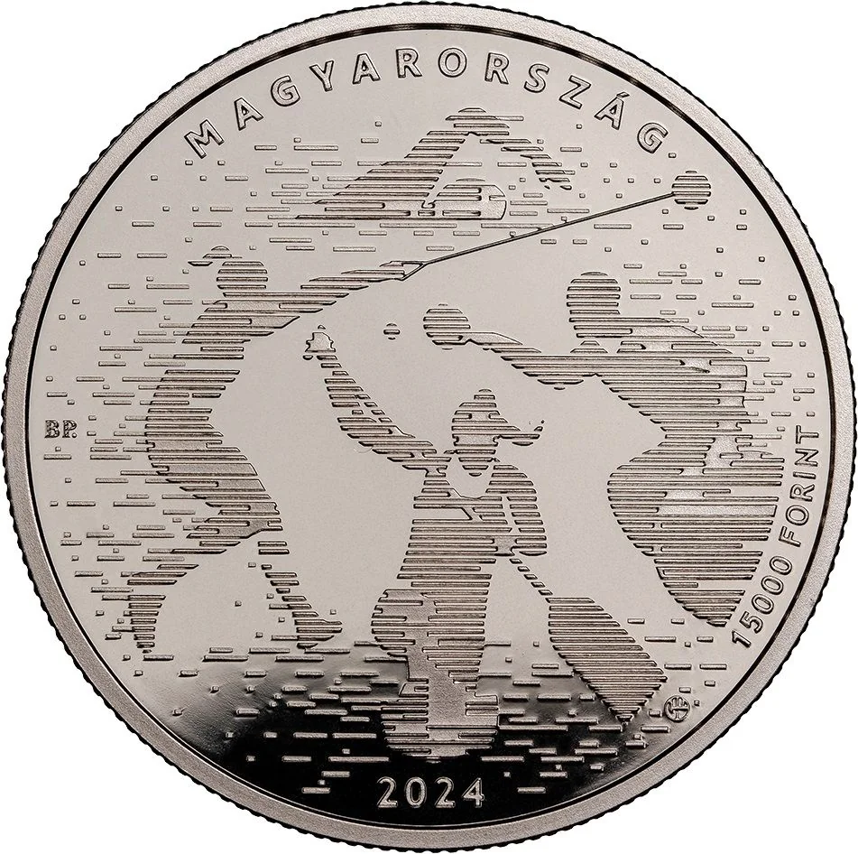 The coin's front modernly depicts four Hungarian medal-contender sports: hammer throw, canoeing, swimming, and para table tennis.