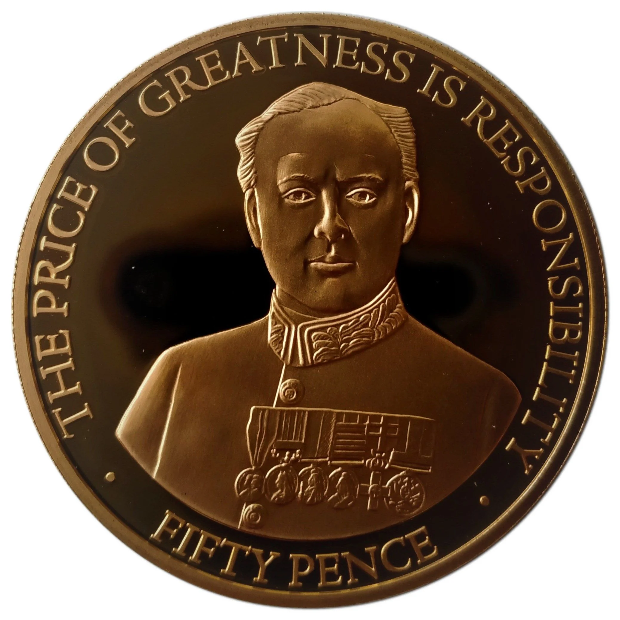 Churchill in uniform, encircled by legend.