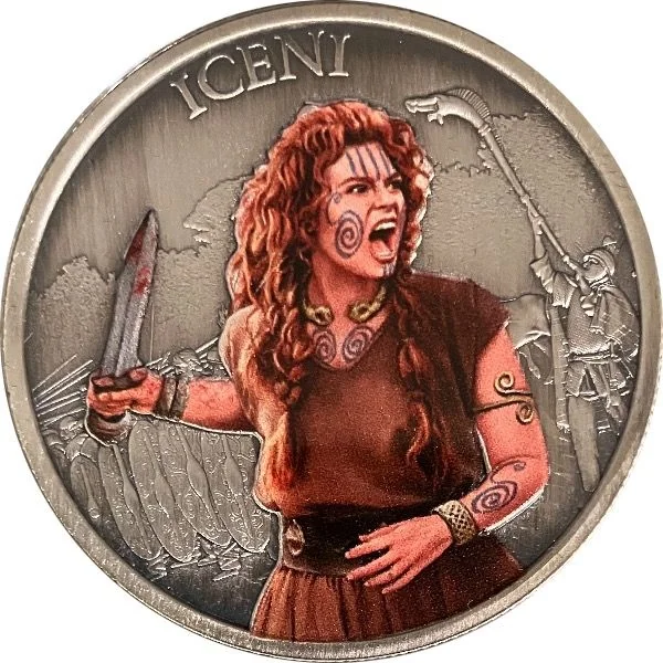 Original full-color illustration by Jean-Michel Girard depicting an Iceni warrior with a sword and her army.
