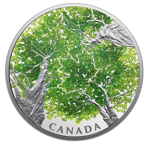 Your coin captures a summer view of a sugar maple, looking up from its base through engraved branches to a sunlit canopy. Inspired by crown shyness, the proof finish shines like sunlight through gaps in the coloured leaves.