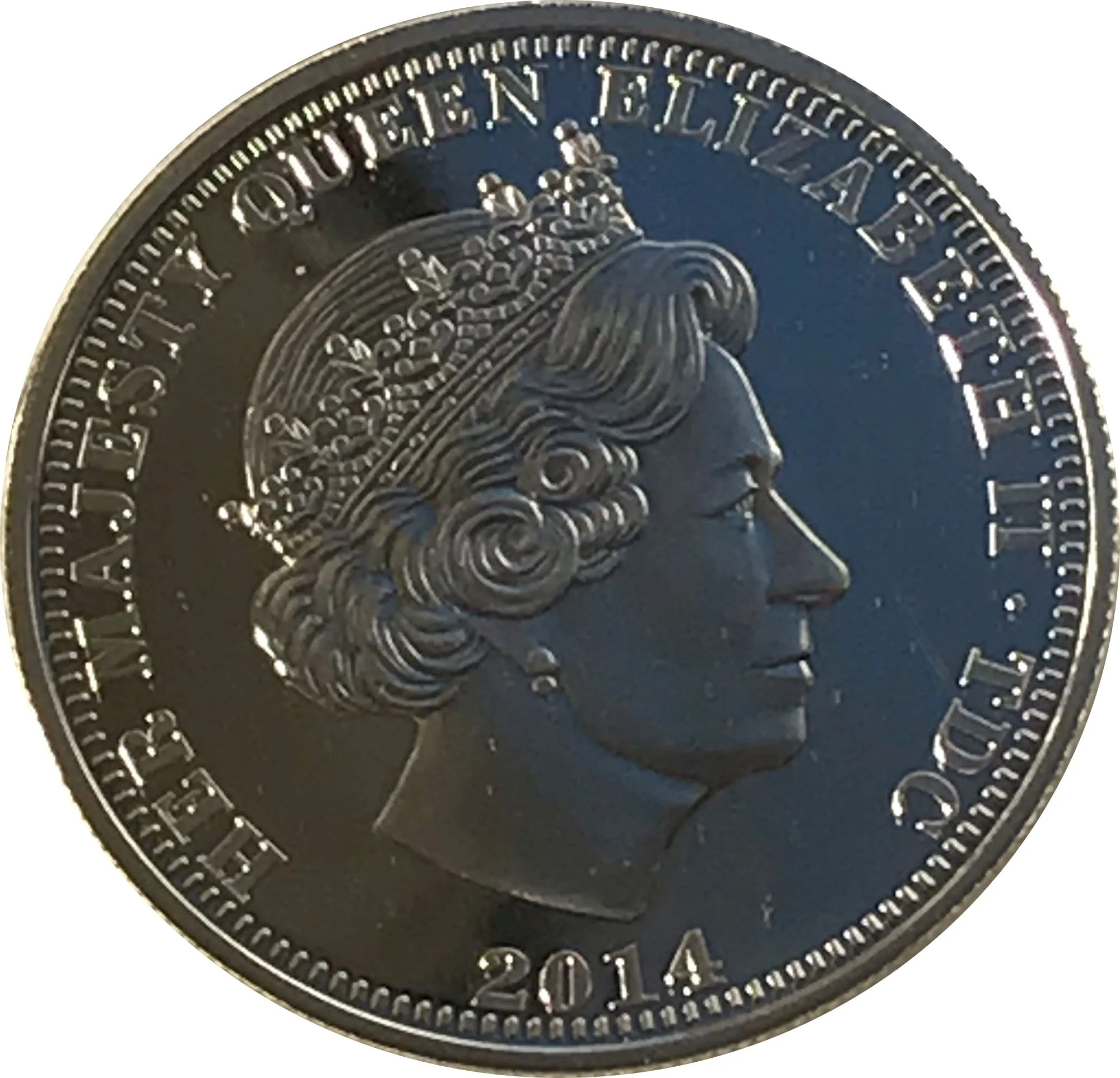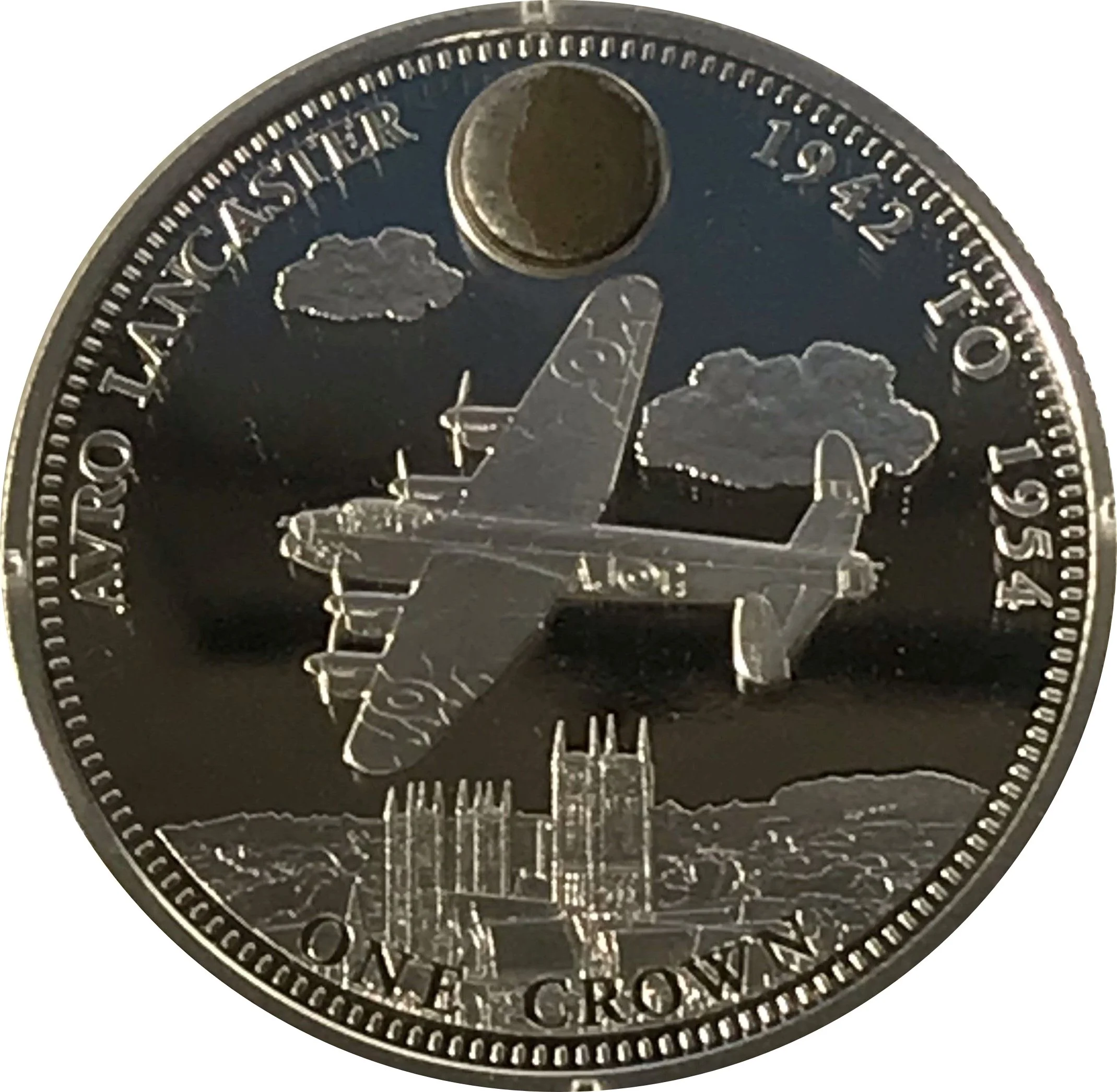 Description: Avro Lancaster flying left over Lincoln Cathedral, framed by two clouds. Above, a strip of original Lancaster metal from WWII. The aircraft's name and service years flank the metal, with the coin's denomination below the cathedral.