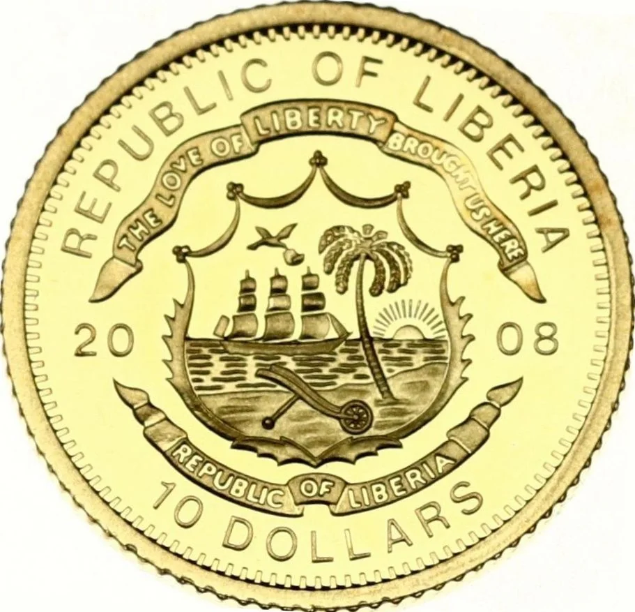 Liberian coat of arms divides date, denomination below.