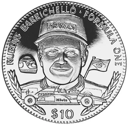 Rubens Barrichello bust with helmet, race car, and wreath-adorned flag.