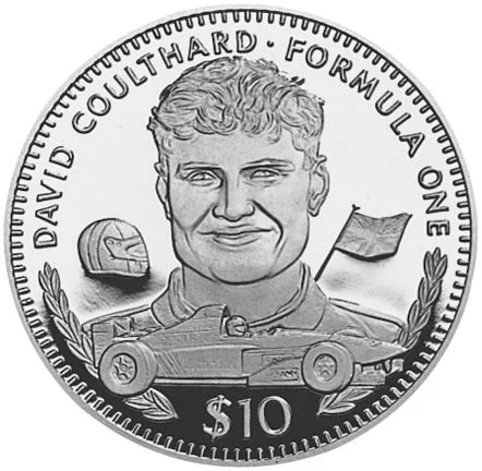 David Coulthard's bust with helmet, race car, and flagged wreath.