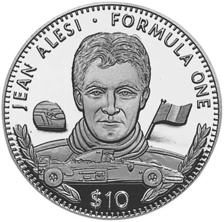 Jean Alesi bust with helmet, race car, and wreath-adorned flag.