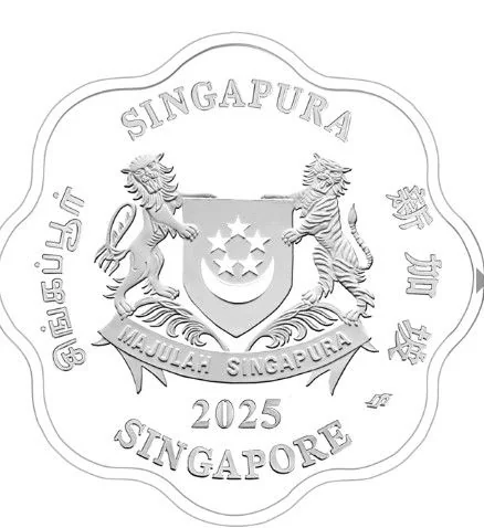 Emblem with date; 'Singapore' encircles it in English, Tamil, Chinese, and Malay.