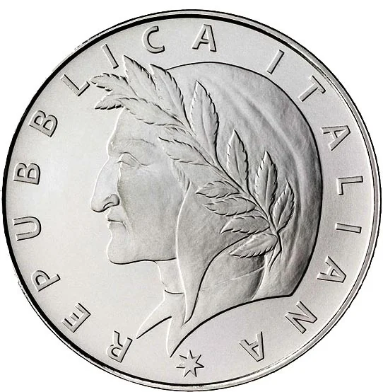Dante Alighieri, detail from a Botticelli painting. Encircled by "REPUBBLICA ITALIANA" and a star.