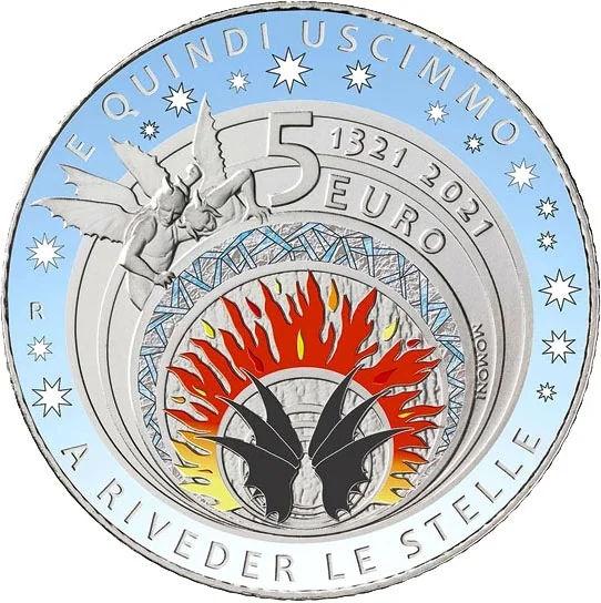 A stylized Dante’s *Inferno* featuring the nine circles, devil’s wings, fire, and ice. Includes a detail from Luca Signorelli’s Orvieto frescoes. The coin bears the verse “E QUINDI USCIMMO A RIVEDER LE STELLE” surrounded by stars, the value “5 EURO”, the dates “1321 2021”, the Rome Mint mark “R”, and designer “MOMONI”. With coloured elements.
