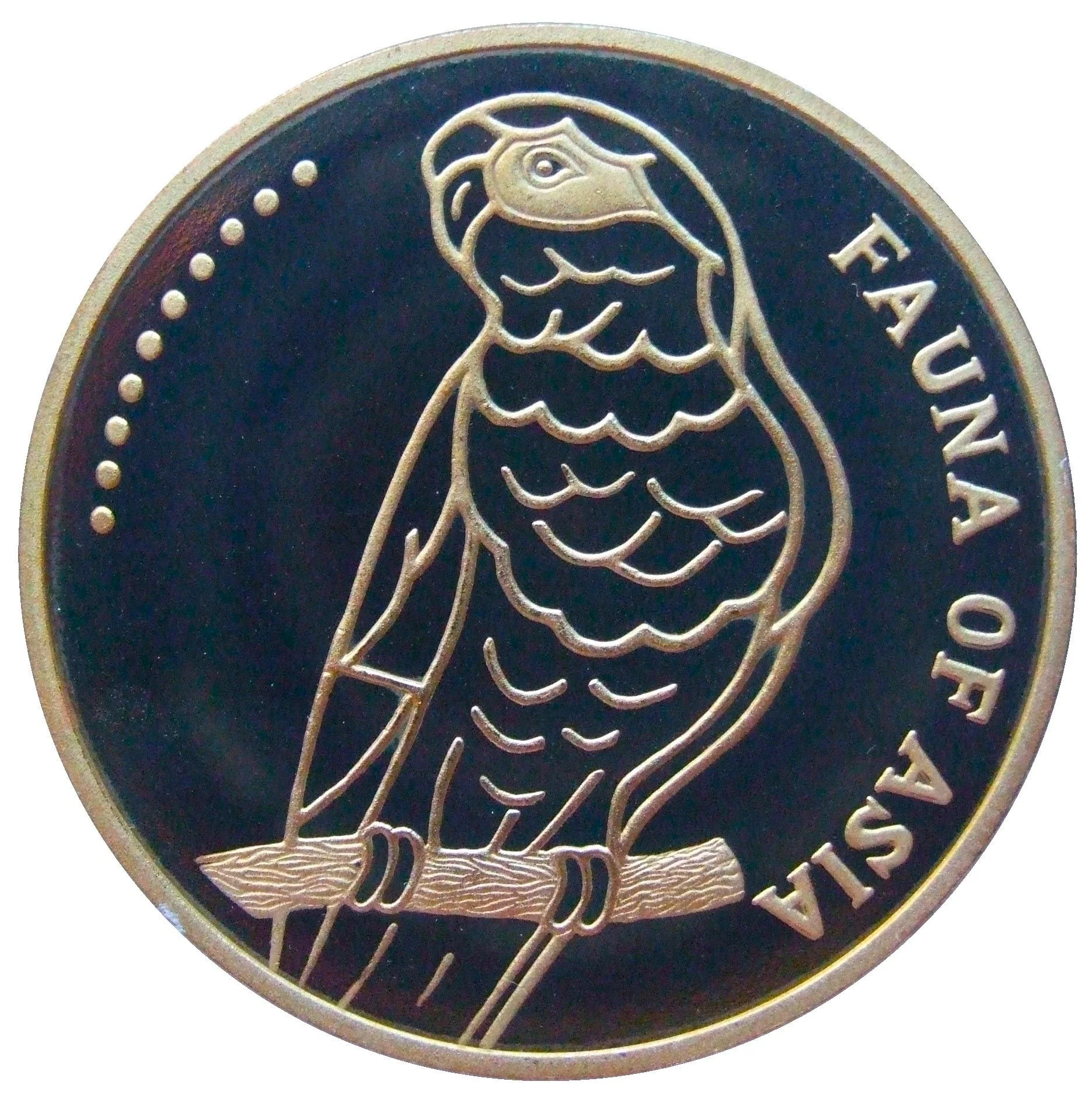 Ten left dots. Central parrot. Asian fauna on right.