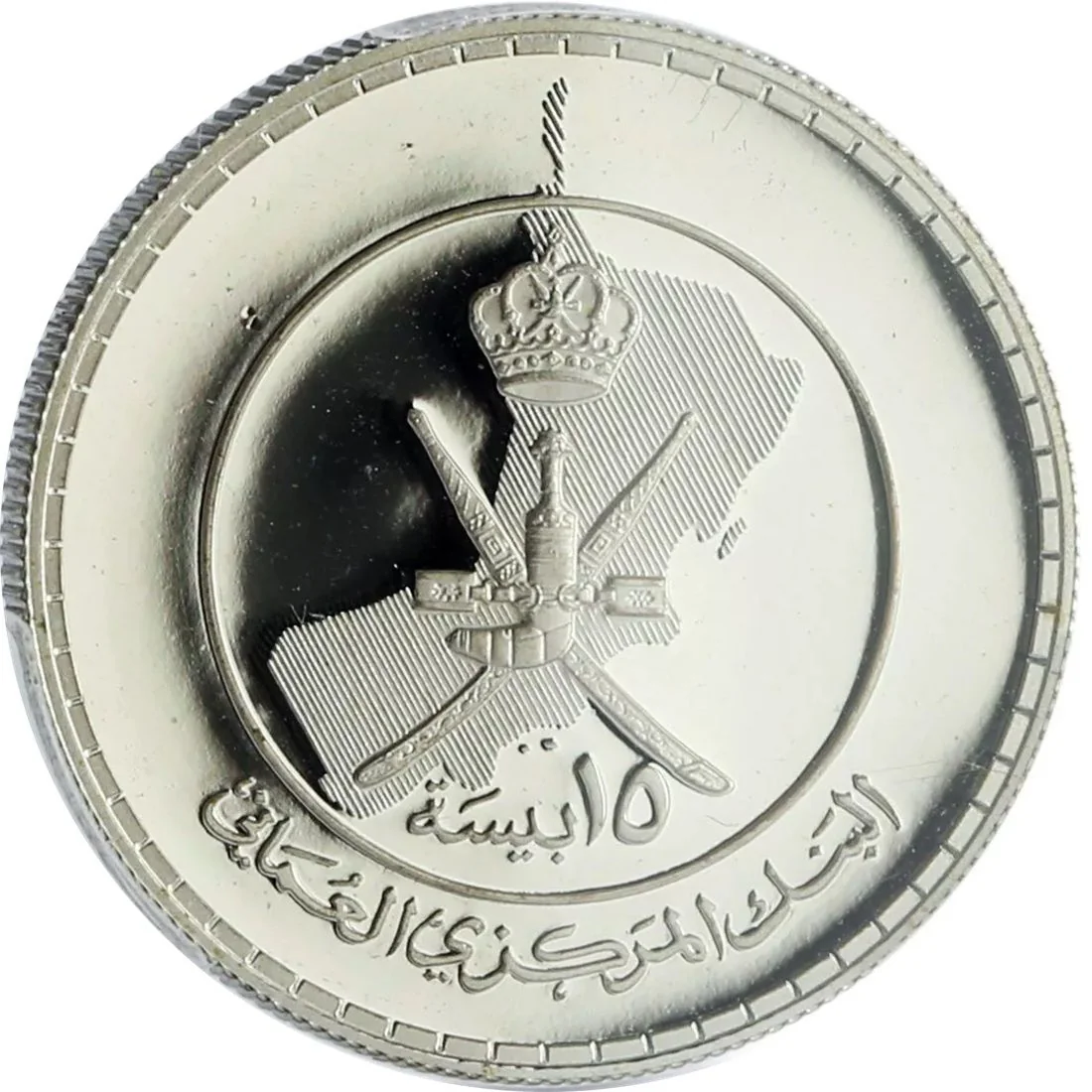 Oman's national emblem—a sheathed khanjar over crossed swords and a map—above the value.