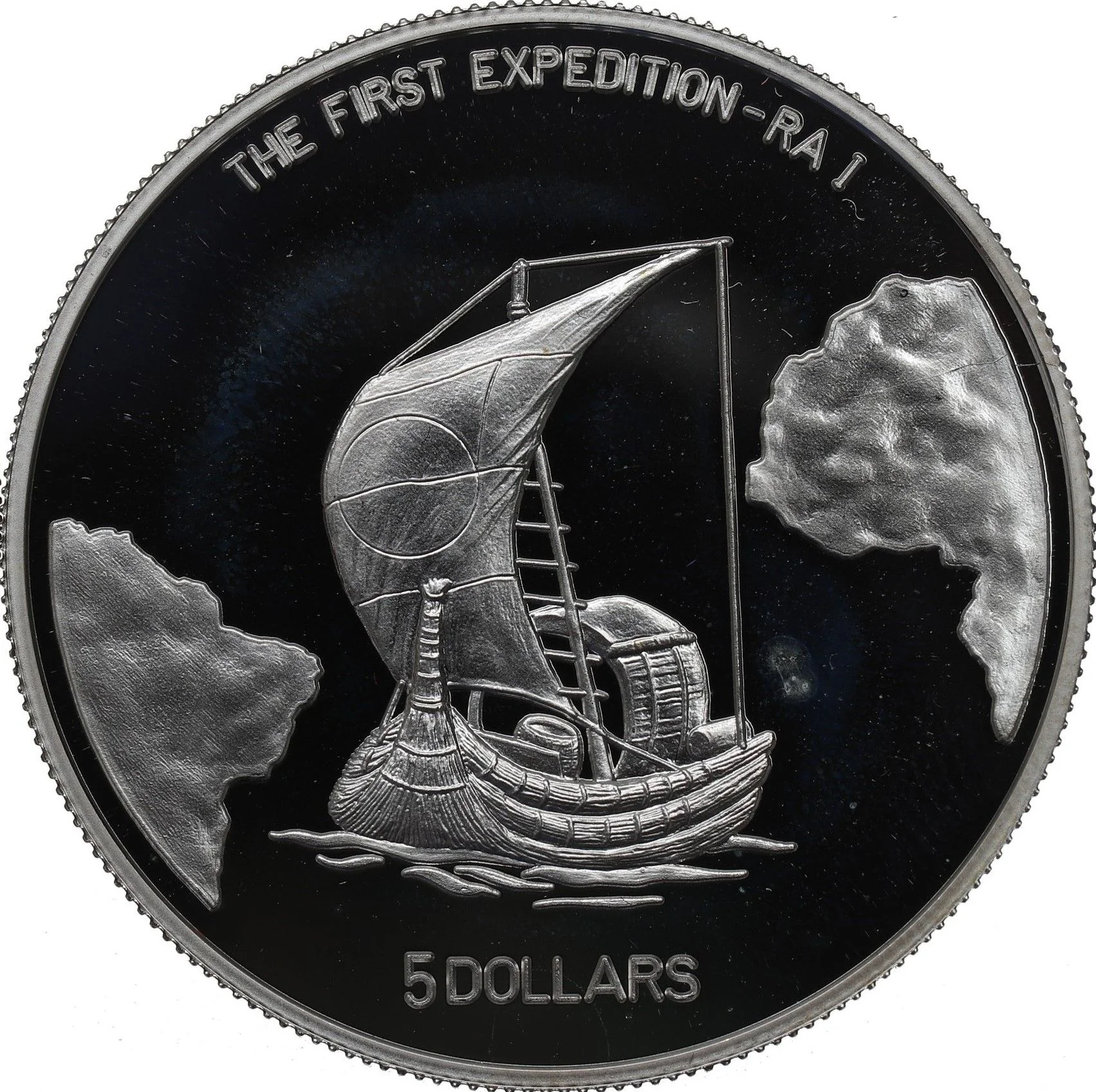 Reed boat Ra I sailing left, flanked by maps of America and Africa.
