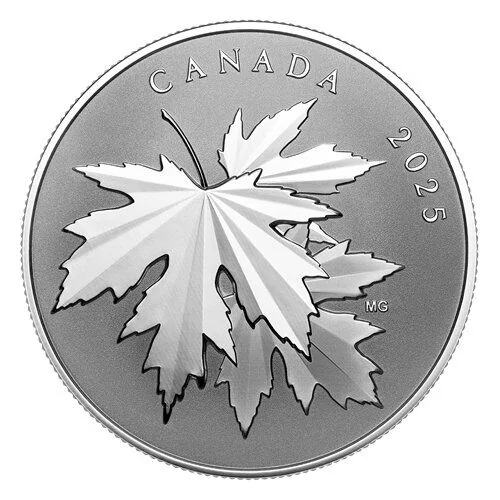 The reverse features three engraved silver maple leaves, their faceted lines angled to reflect light in multiple directions.