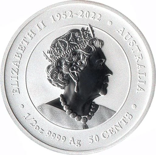 Queen Elizabeth VI crowned portrait facing right, wearing the George IV State Diadem and Victorian Coronation Necklace.