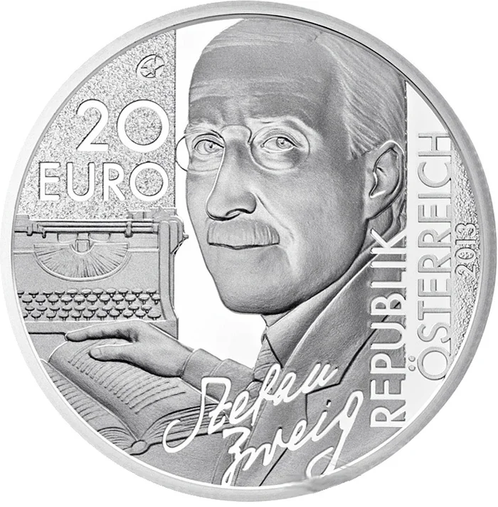 Portrait of Stefan Zweig at his typewriter, holding a book. The Europa Star program logo is at 11 o'clock.