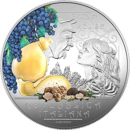 Background features wrought iron decorations typical of Molise, showcasing two Devil masks from Campobasso's Corpus Domini parade. Foreground displays black and white truffles, a caciocavallo cheese, and Tintilia grapes. "MOLISE" is at the top; "REPUBBLICA ITALIANA" and "M. BONIFACIO" are in the exergue. A colorful coin.