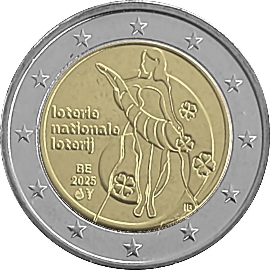 The center features Fortuna with her horn of plenty, alongside four four-leaf clovers. The National Lottery logo appears behind her. The left side displays the text “loterie nationale loterij,” while the bottom left shows “BE 2025” with the Utrecht mintmark and Belgian director’s mark. The designer’s initials are at the bottom right. The European stars circle the outer ring.