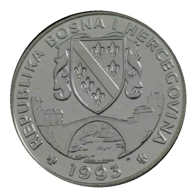Bosnian emblem above Mostar Bridge; mintmark below bridge, right of date.