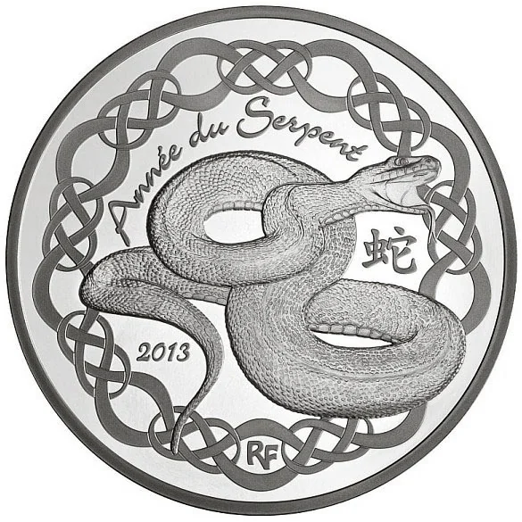 The inner coin features a snake encircled by "Year of the Snake," "2013," and Chinese characters, all within a scroll-like frieze. This marks the Year of the Water Snake, the sixth zodiac sign.