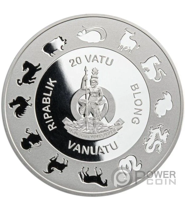 Description: Vanuatu's arms show a warrior before a curved boar's tooth and the motto "LONG GOD YUMI STANAP", encircled by zodiac animals, with the value above and country name below.