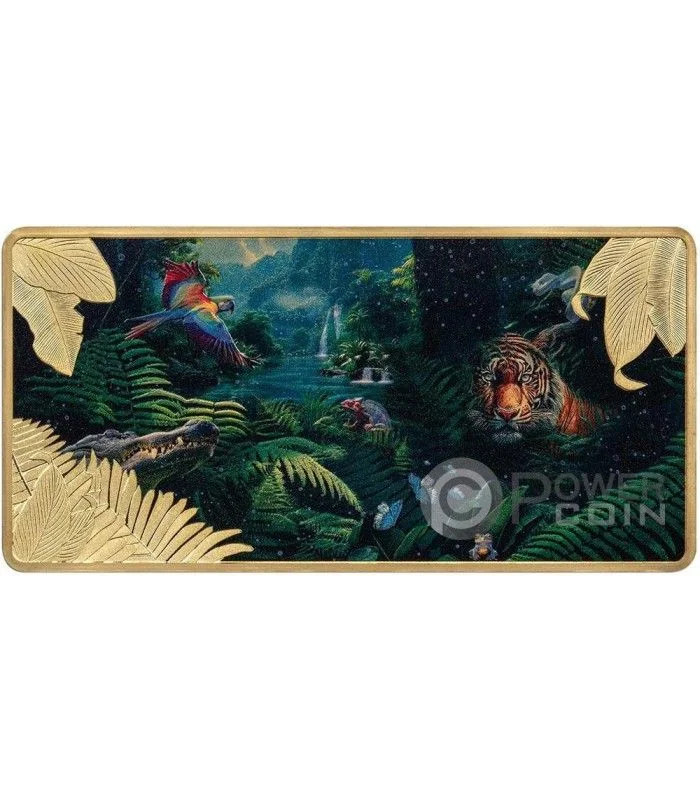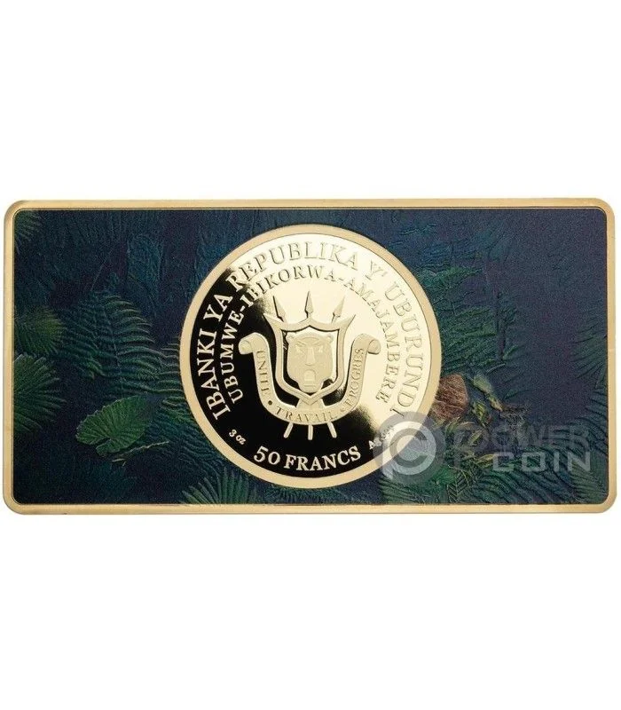 Description: Central colourized jungle scene encircling a coat of arms, with bank name above, and weight, value, and fineness below. Legend in Kirundi and French.