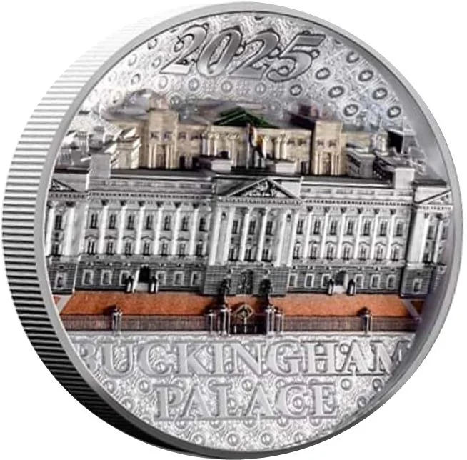 Description: Left-facing portrait of King Charles III, encircled by legend and date, framed with Buckingham Palace ornamental details.
