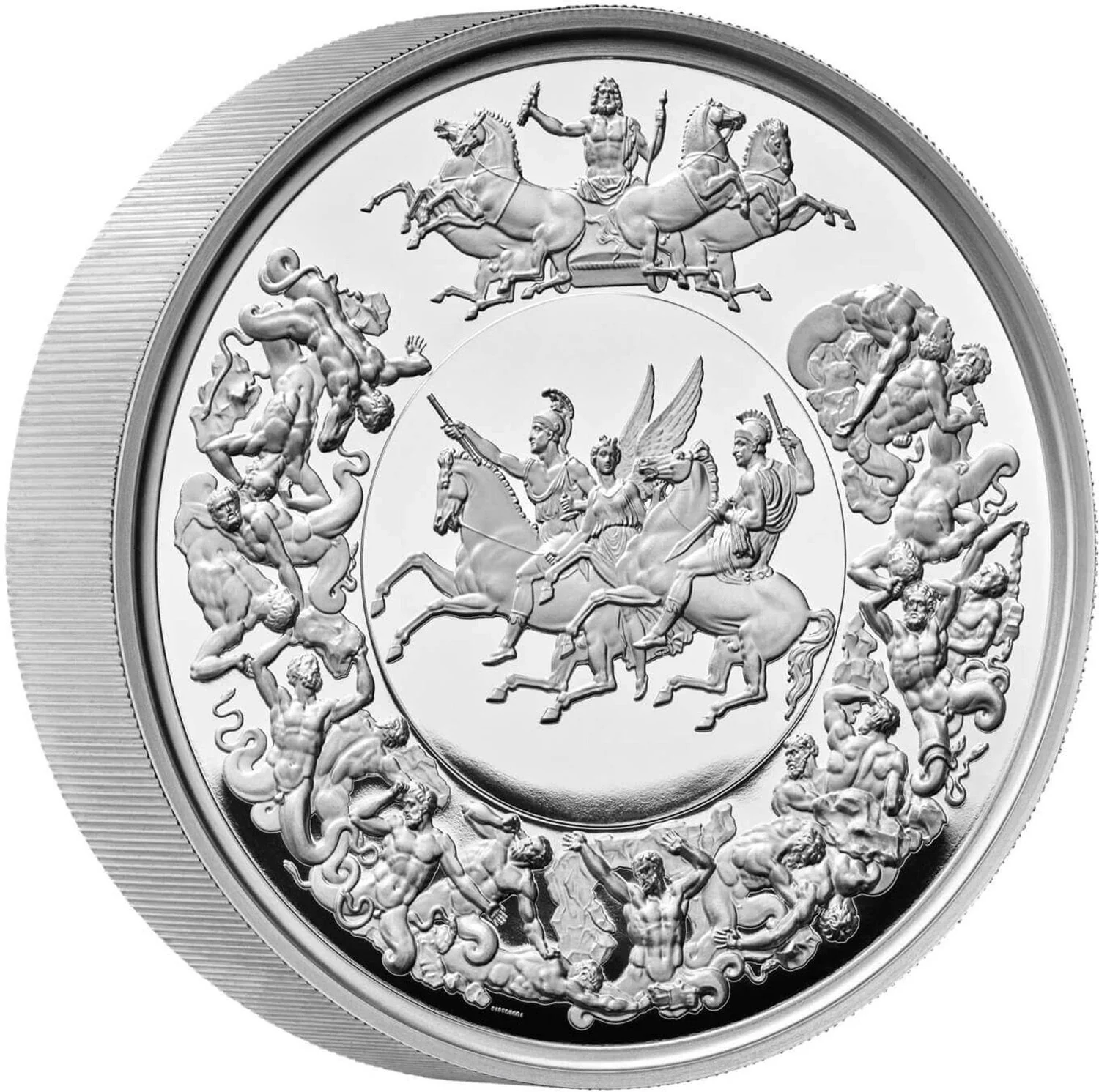 Wellington and Blücher as horsemen with Nike and Zeus’s chariot, encircled by serpent-legged men.
