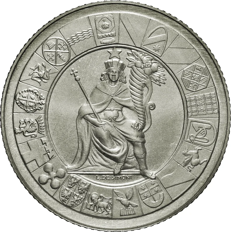 Allegory of Italy: a crowned, enthroned woman holding a scepter and cornucopia, encircled by the arms of Italy's regions.