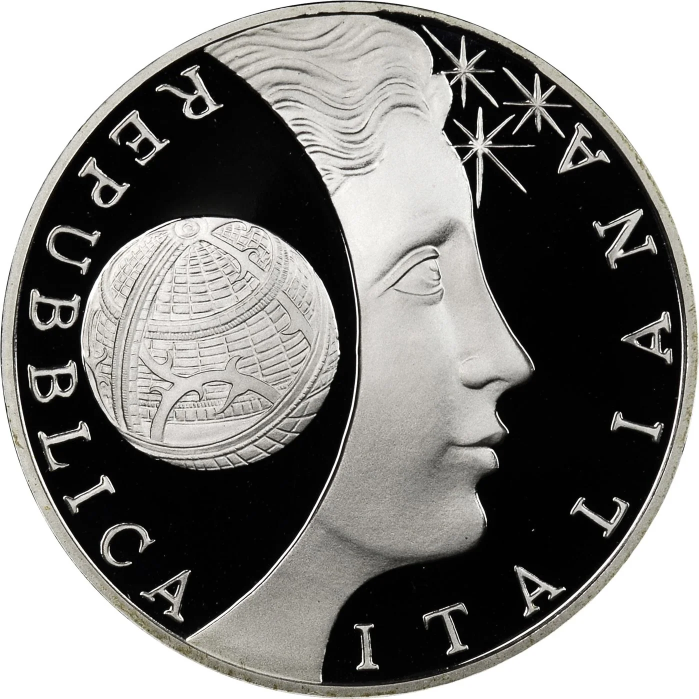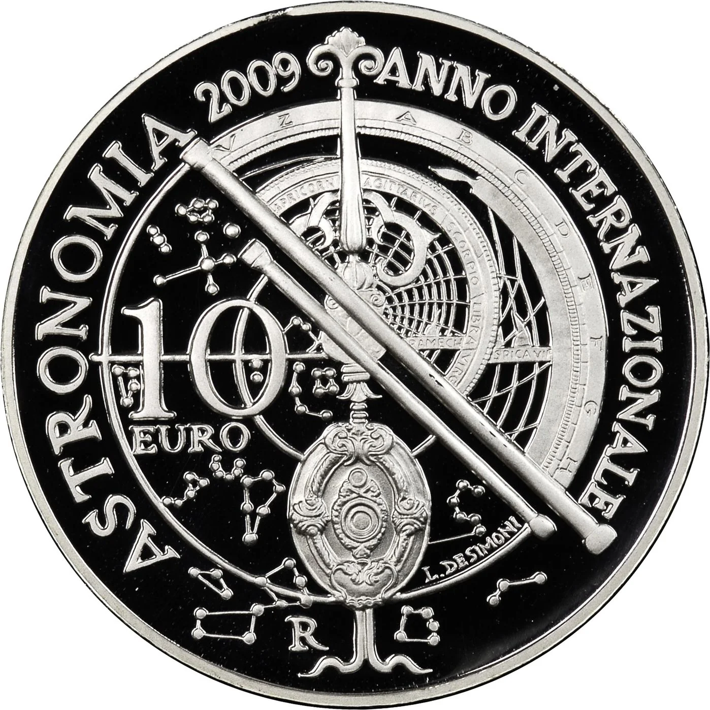 Split diagonally by Galileo's telescope, featuring a celestial detail (lower right) and an ancient astrolabe. At left, constellations flank the two-line value. Below, the astrolabe's base separates the mintmark from more constellations.