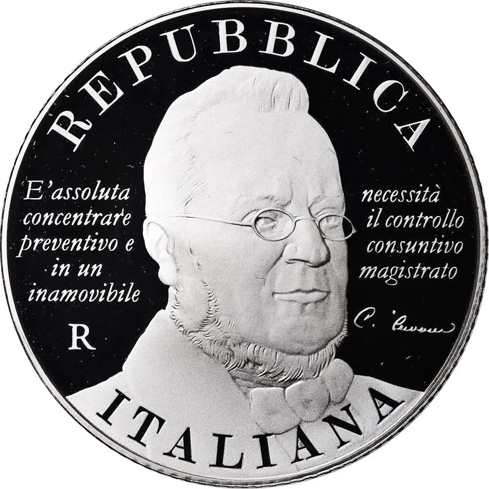 Portrait of Count Camillo Benso di Cavour by Francesco Hayez. Flanked by his statement affirming the necessity of a Court of Auditors. Mintmark at lower left.