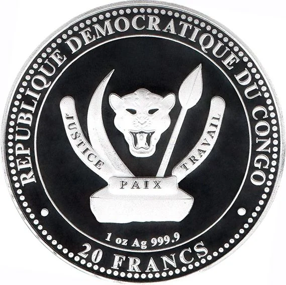 Coat of arms centered, country name above, weight, fineness, and value below.