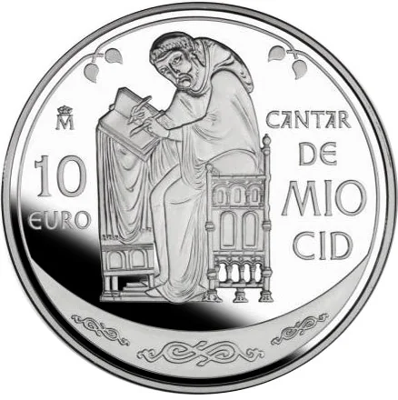 Doña Jimena, full-length and front-facing, with pillars and architectural designs behind her.