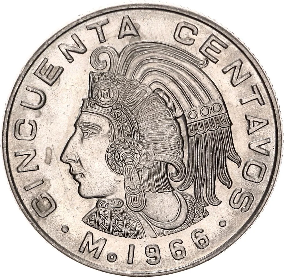 King Cuauhtemoc facing left, wearing a feather crown. The value is above. The mintmark 'Mo' appears in the crown and 'oM' below the bust beside the date.