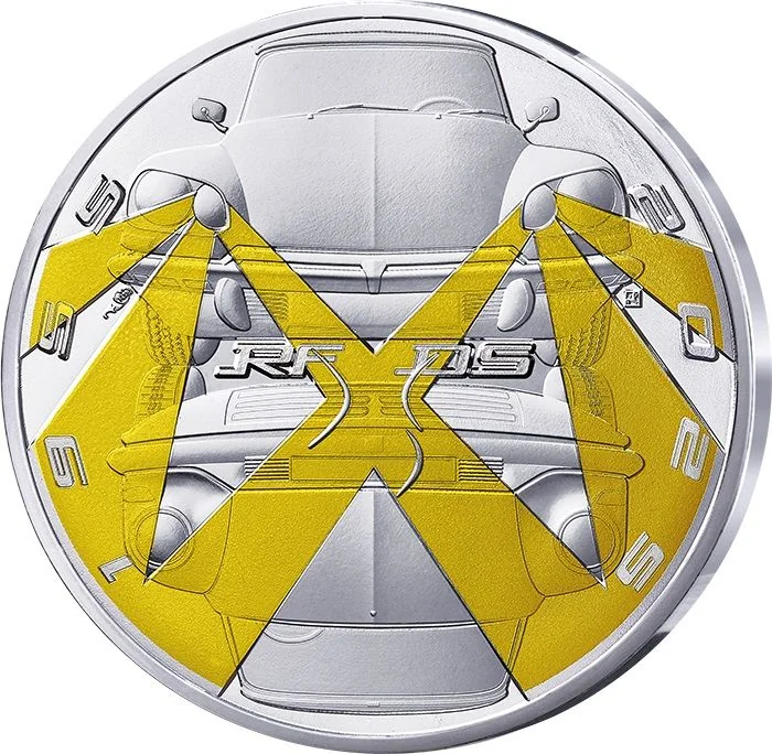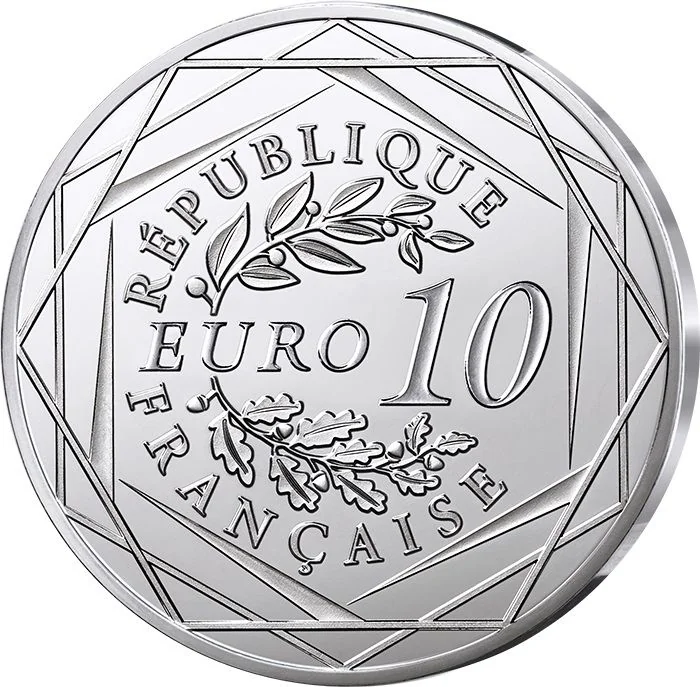 "10 EURO" flanked by laurel and oak branches, within three hexagons inscribed "RÉPUBLIQUE FRANÇAISE" and the year.
